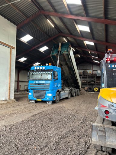 Met onze eigen vrachtwagen en dieplader kunnen wij tot 27 tons machines transporteren. Tegenwoordig beschikken wij ook over een gestuurde kieptrailer waarmee wij zand en grind kunnen transporteren.